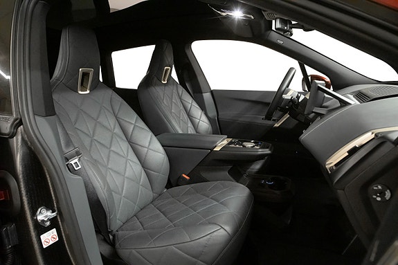 Her har du en iX i en nydelig og sjelden fargekombinasjon. Aventurin Red Metallic gir bilen et eksklusivt, dypt og nesten vinrødt preg i skygge og et levende, glødende uttrykk i sollys. Sammen med Atelier sorte skinnseter og mørkt taktrekk fremstår bilen både moderne, elegant og kraftfull.
