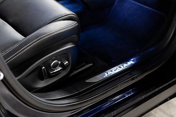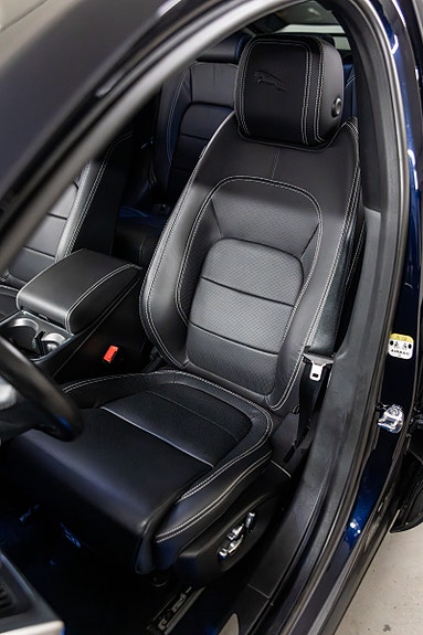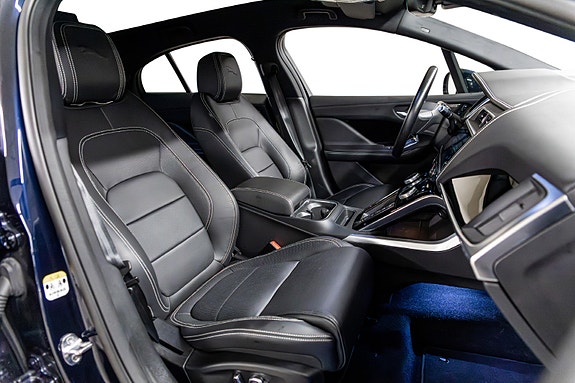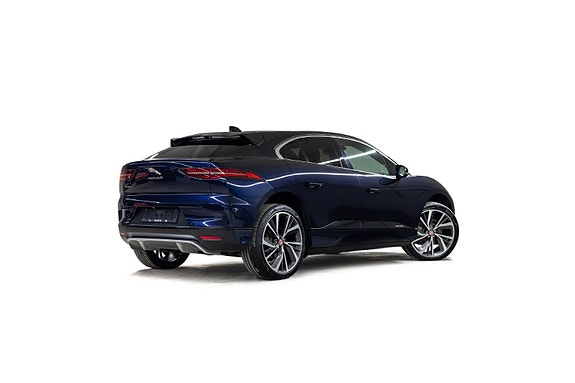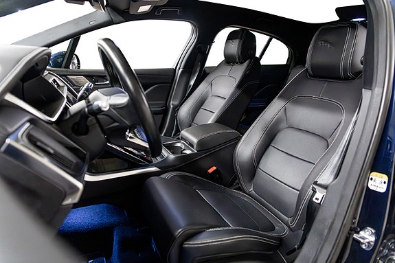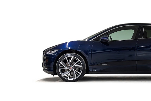 Dette er en særdeles lekker og velutstyrt Jaguar I-PACE HSE i den elegante og eksklusive fargen Portofino Blue metallic, kombinert med sorte perforerte Windsor skinnseter og rålekre 22 Diamond Turned aluminiumsfelger. En kombinasjon som virkelig kler bilens sportslige og luksuriøse uttrykk.