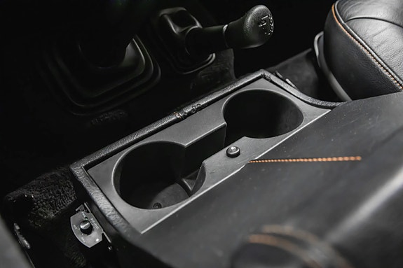 Oppbevaringsrom i midtkonsollen med skinntrukket lokk med oransje kontrastsømmer