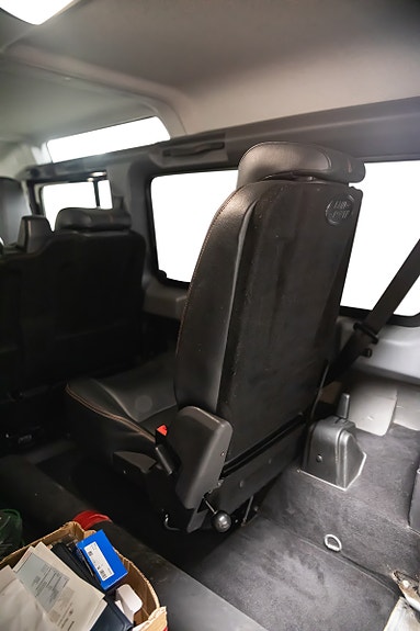 Sorte premium skinnseter med LXV brodert på hodestøttene samt oransje kontrastsømmer