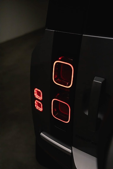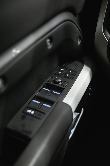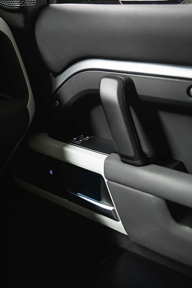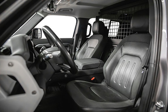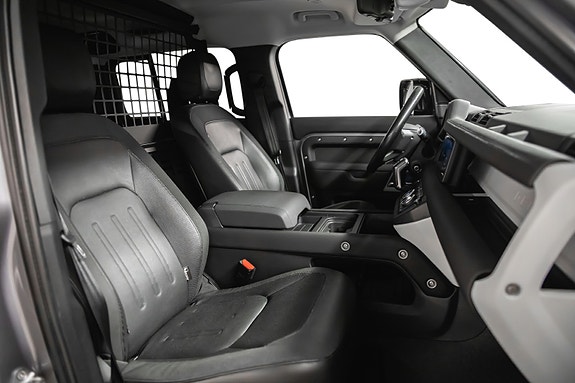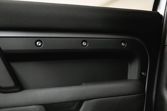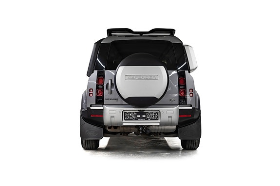 En rålekker Defender i den populære fargen Eiger Grey metallic, med sort kontrast og tøff offroad-styling. En bil som gjør seg like godt på byggeplassen som foran hytta på fjellet.