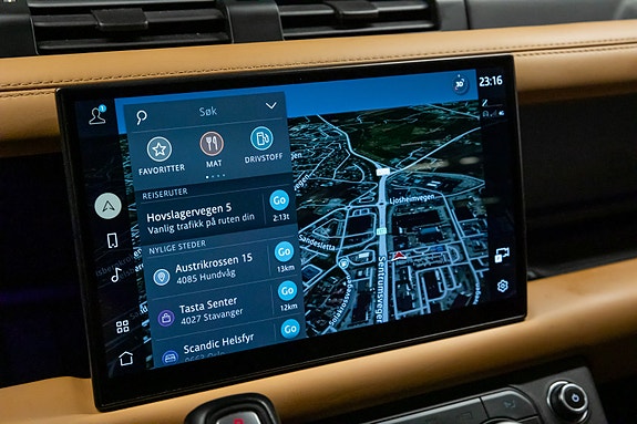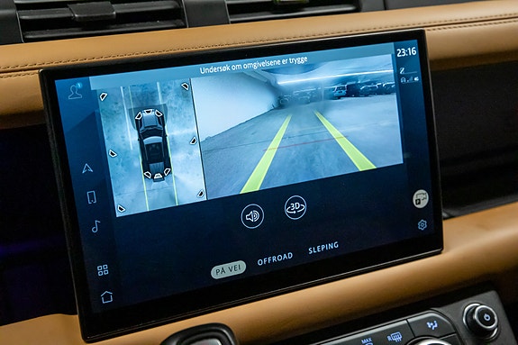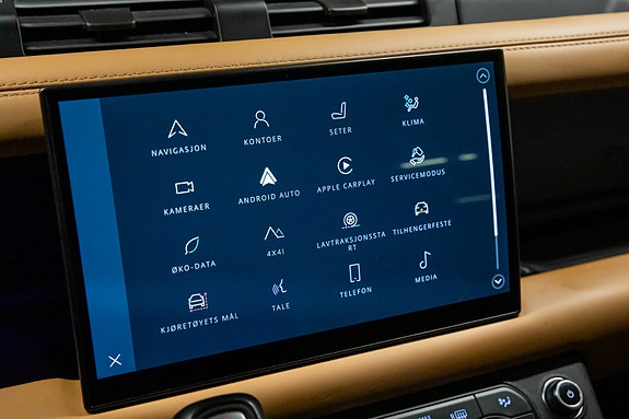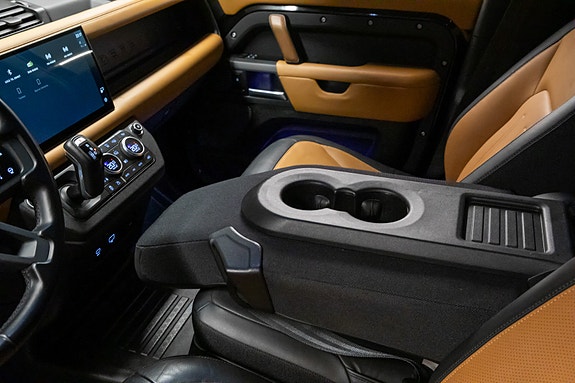 Innvendig møter du et svært lekkert interiør i Vintage Tan & sorte perforerte Windsor skinnseter, kombinert med sort taktrekk og detaljer i lys tre en perfekt balanse mellom robust Defender-DNA og moderne premiumfølelse.