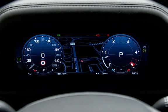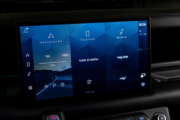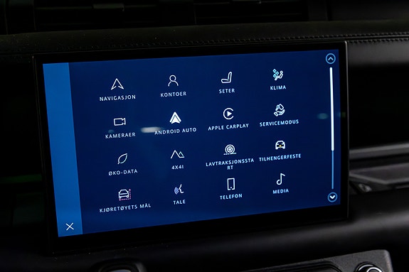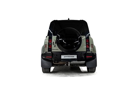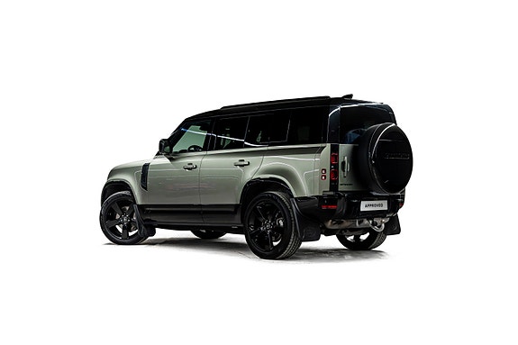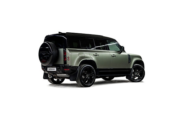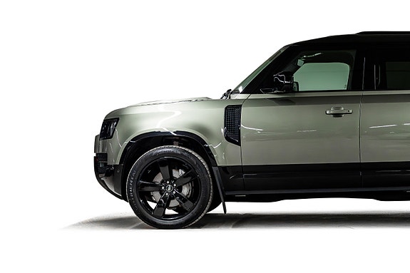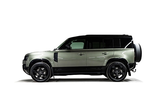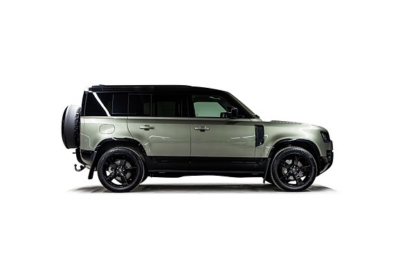 Dette er en Defender som treffer blink både visuelt og teknisk. I den dype og eksklusive Pangea Green metallic, kombinert med sorte perforerte Windsor skinnseter, 22 sorte alu-felger, sorte detaljer og sort reservehjulscover, fremstår bilen rå, gjennomført og kompromissløs.