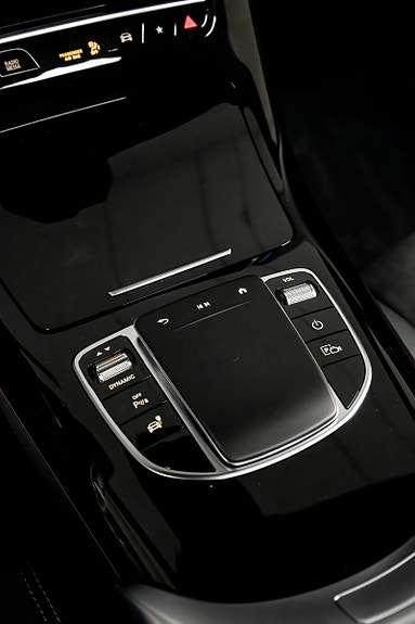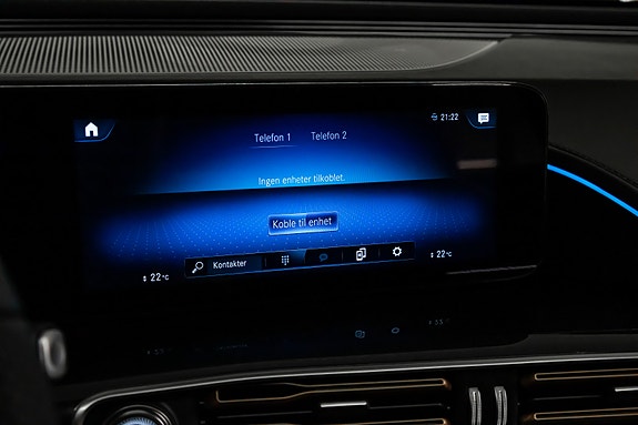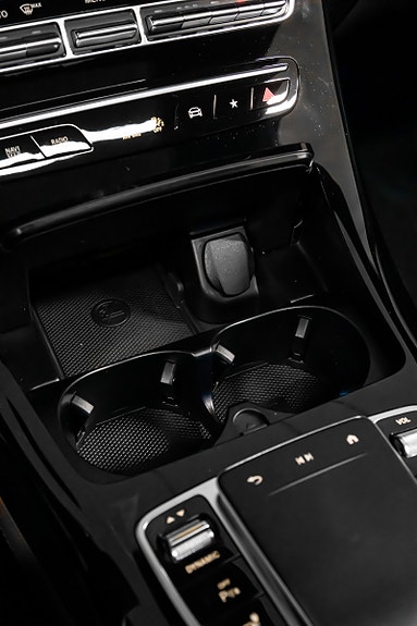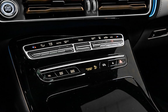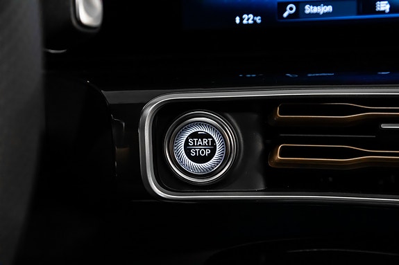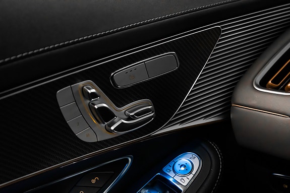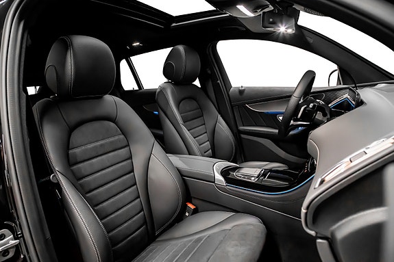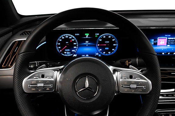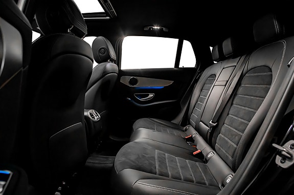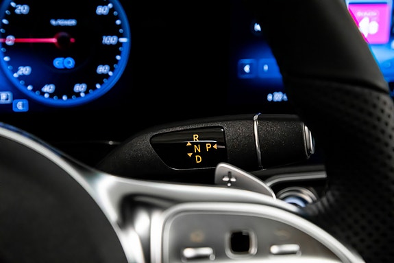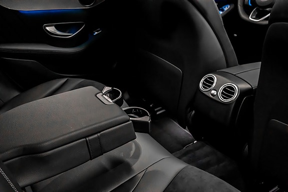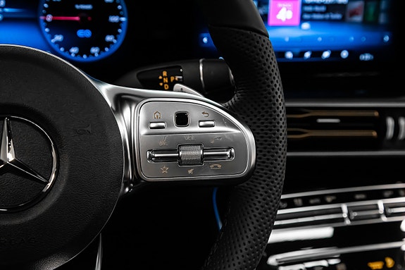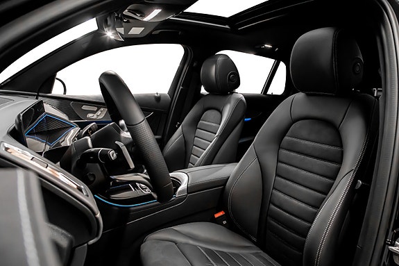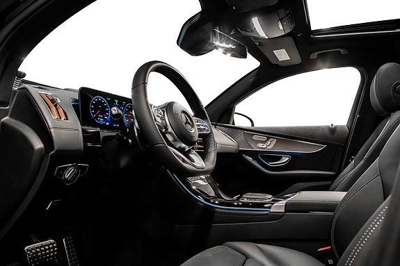 Innvendig finner du AMG Line interiør med dashbord i ARTICO, carbonfiber-look dekor, multifunksjons sportsratt i nappaskinn, sorte taktrekk og AMG gulvmatter alt forsterket av Ambient Lighting som setter stemningen.
